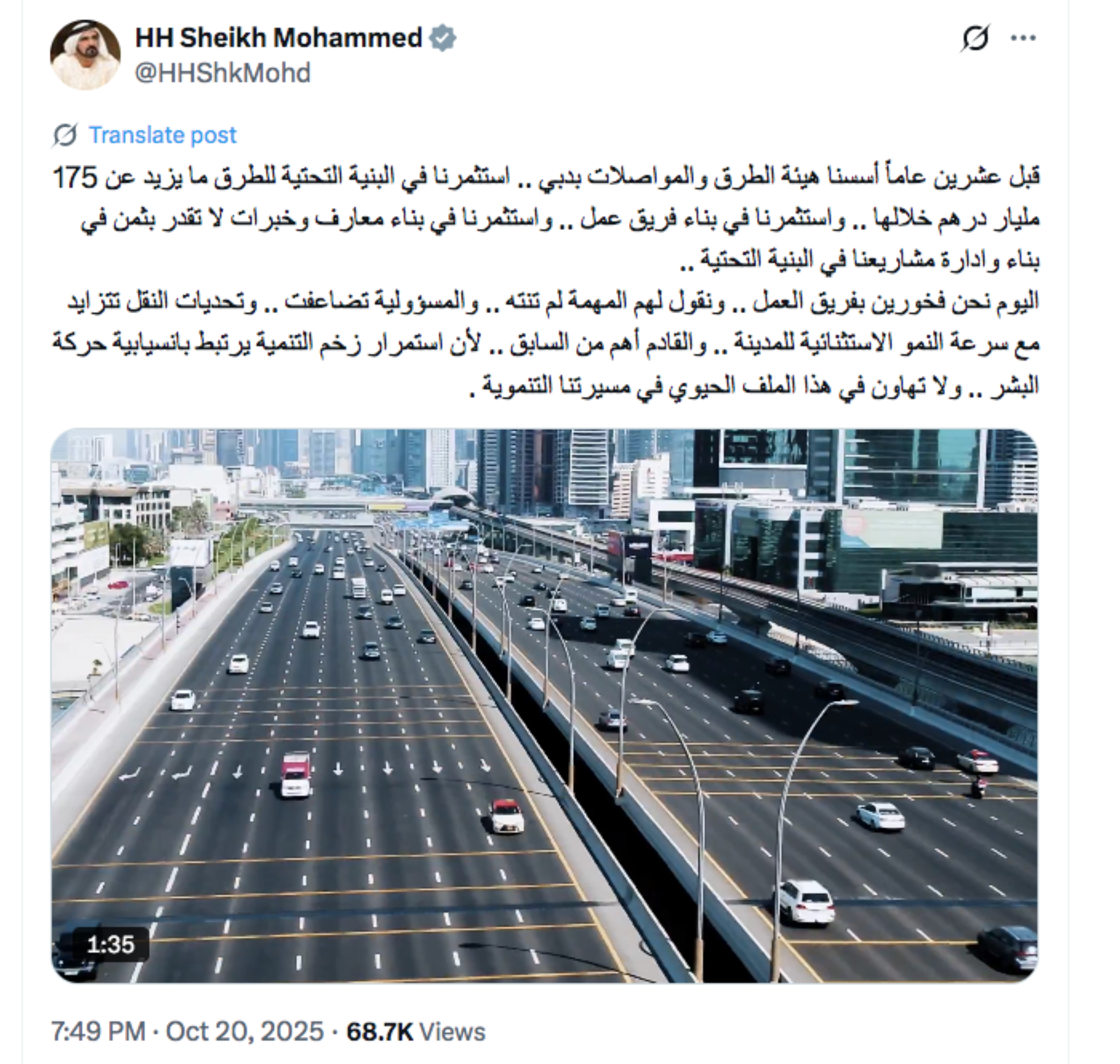 On Monday, His Highness Sheikh Mohammed Bin Rashid Al Maktoum, Vice President and Prime Minister of the United Arab Emirates (UAE) and Ruler of Dubai, took to the X platform to reflect on the significant strides made by the Roads and Transport Authority (RTA) since its inception two decades ago. This pivotal establishment has not only redefined the transport landscape in one of the world’s fastest-growing cities but also positioned Dubai as a model for modern infrastructure development.