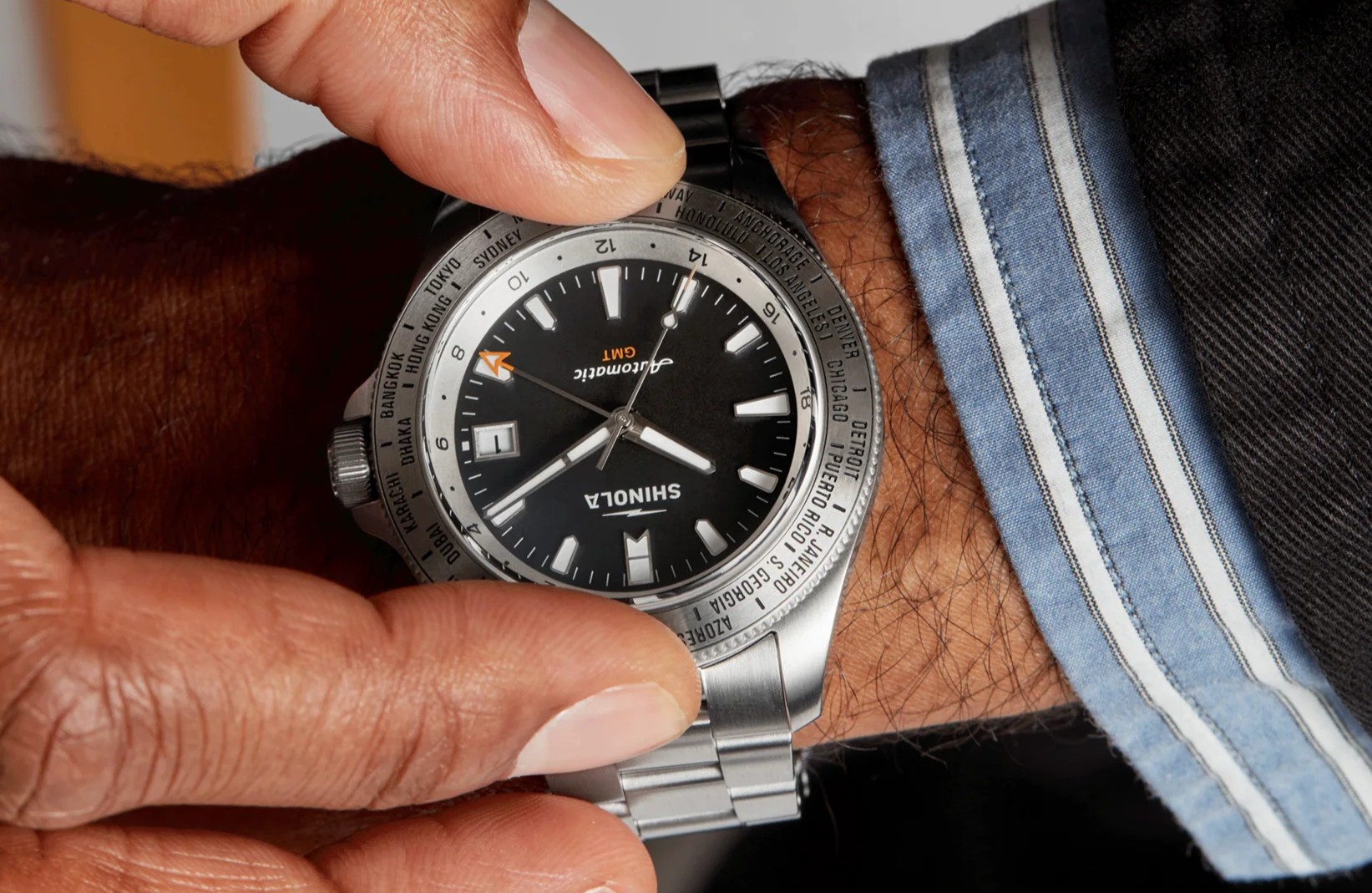 Aesthetically, the Shinola Monster GMT Worldtimer impresses with a design that marries elegance and ruggedness, suitable for both formal occasions and outdoor activities. The watch features a robust 43mm stainless steel case, providing both durability and a substantial presence on the wrist. The timepiece’s dial is adorned with luminous markers, ensuring readability even in low-light conditions, which is particularly essential for evening travels or nocturnal adventures.